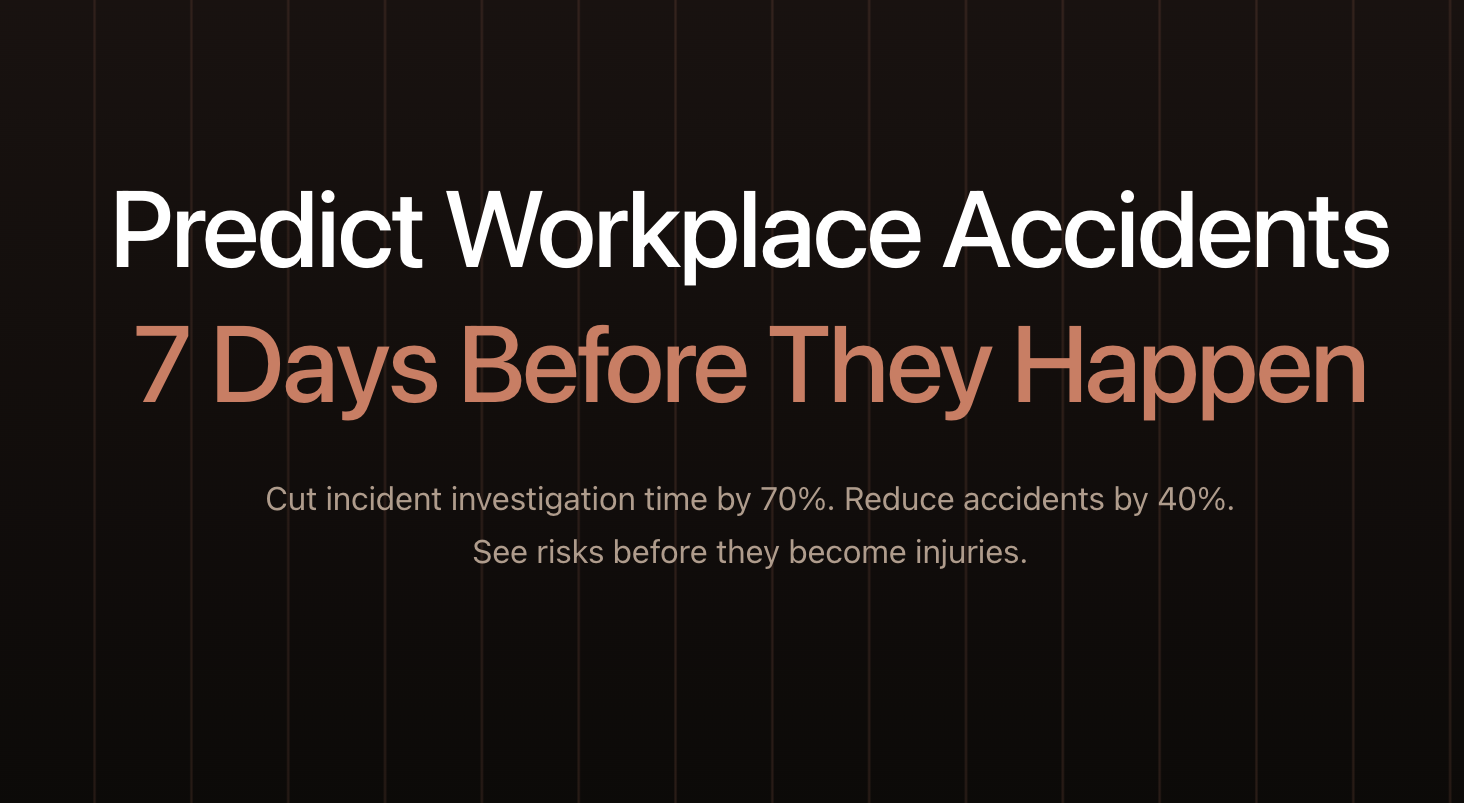 One platform that connects all your safety data. Our AI (trained on millions of industrial incidents) predicts accidents 7-30 days before they happen with 80%+ accuracy. You get simple alerts: what will go wrong, why, and exactly how to prevent it.